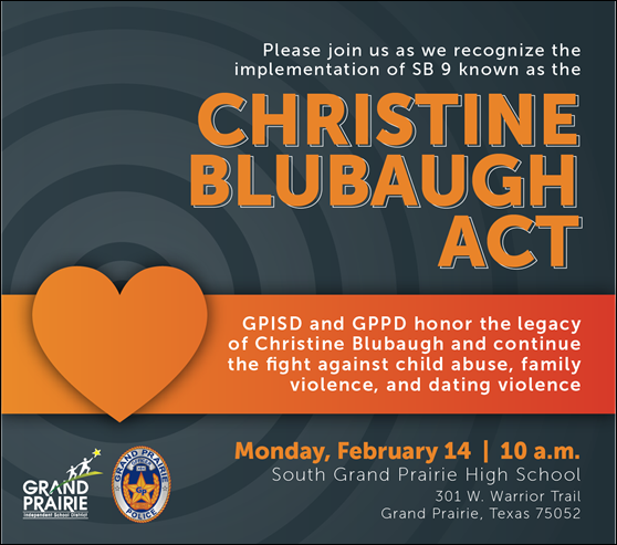 To honor Christine’s legacy and the far-reaching impact of SB 9, GPISD and the Grand Prairie Police Department will host a ceremony at South Grand Prairie High School on Monday, February 14, at 10 a.m.