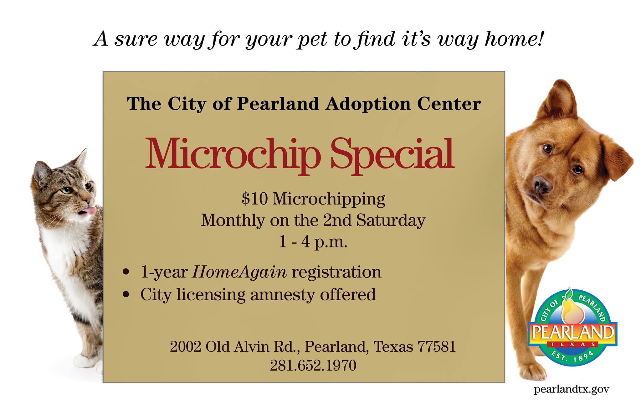 The City of Pearland Adoption Center is seeking volunteers to walk dogs, help with cats and assist with off-site adoptions. Volunteers will also help residents search for lost pets, take photos of animals in need of a home, clean adoption center facilities, and more. Click here to register to volunteer.
